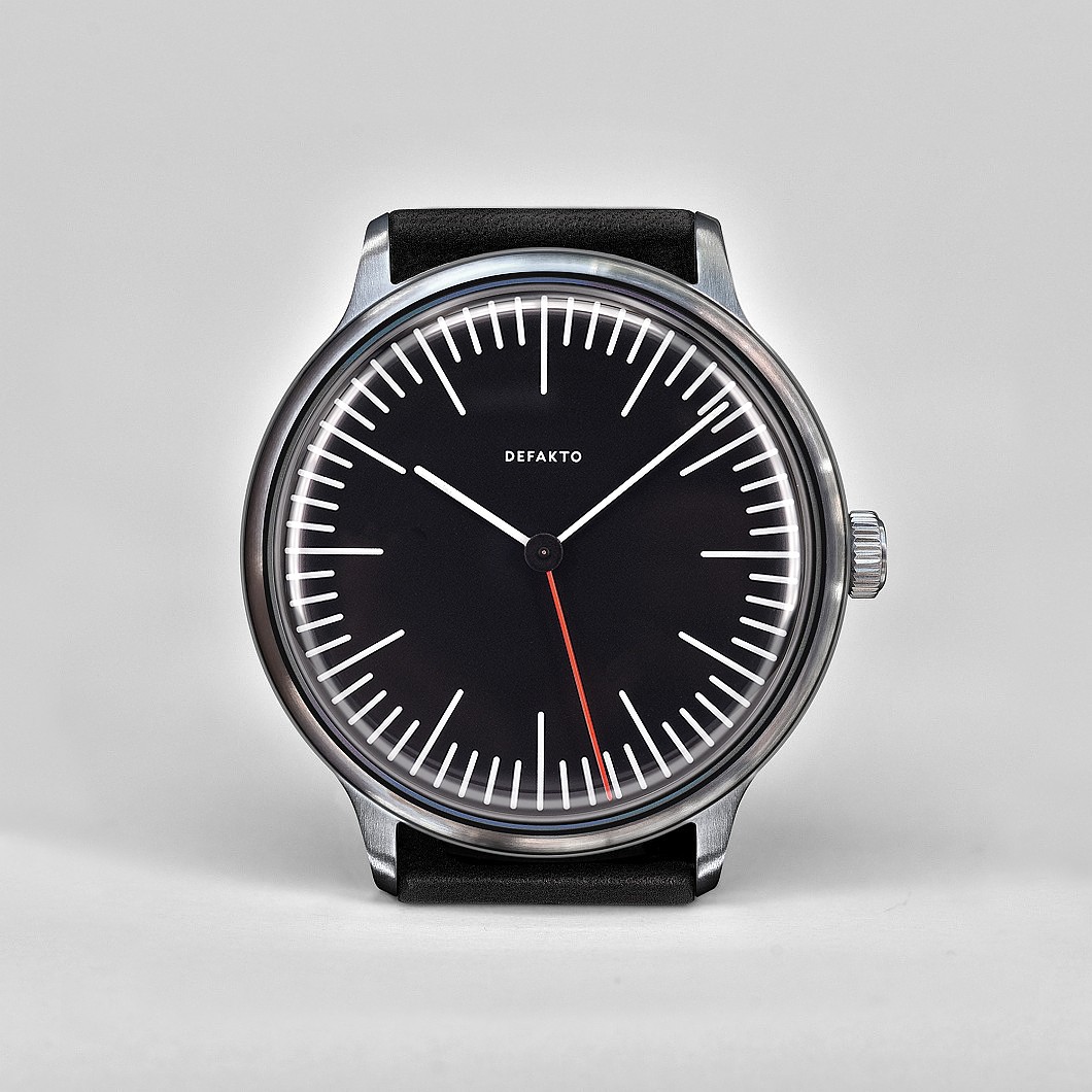 Die Zweizeigeruhr Defakto Dialog Schneeweiss (40mm x 46,8mm x 6,6mm, 44g) zeichnet sich durch ihre Flachheit, ihr zurückhaltendes, minimalistisches Design und Ihre deutliche Zeitabbildung aus. Durch Verzicht auf einen großen Sekundenzeiger entsteht ein sehr ausgeglichenes und ruhiges Erscheinungsbild. Die fein gezeichnete Indexierung harmoniert perfekt mit den leichten, vorne gerundeten Zeigern - beide bewirken eine hervorragende Ablesbarkeit der Zeit und sorgen für einen ausgewogenen Auftritt der Uhr. Das 6,6mm flache 40mm Gehäuse ist 5 Atm wasserdicht.