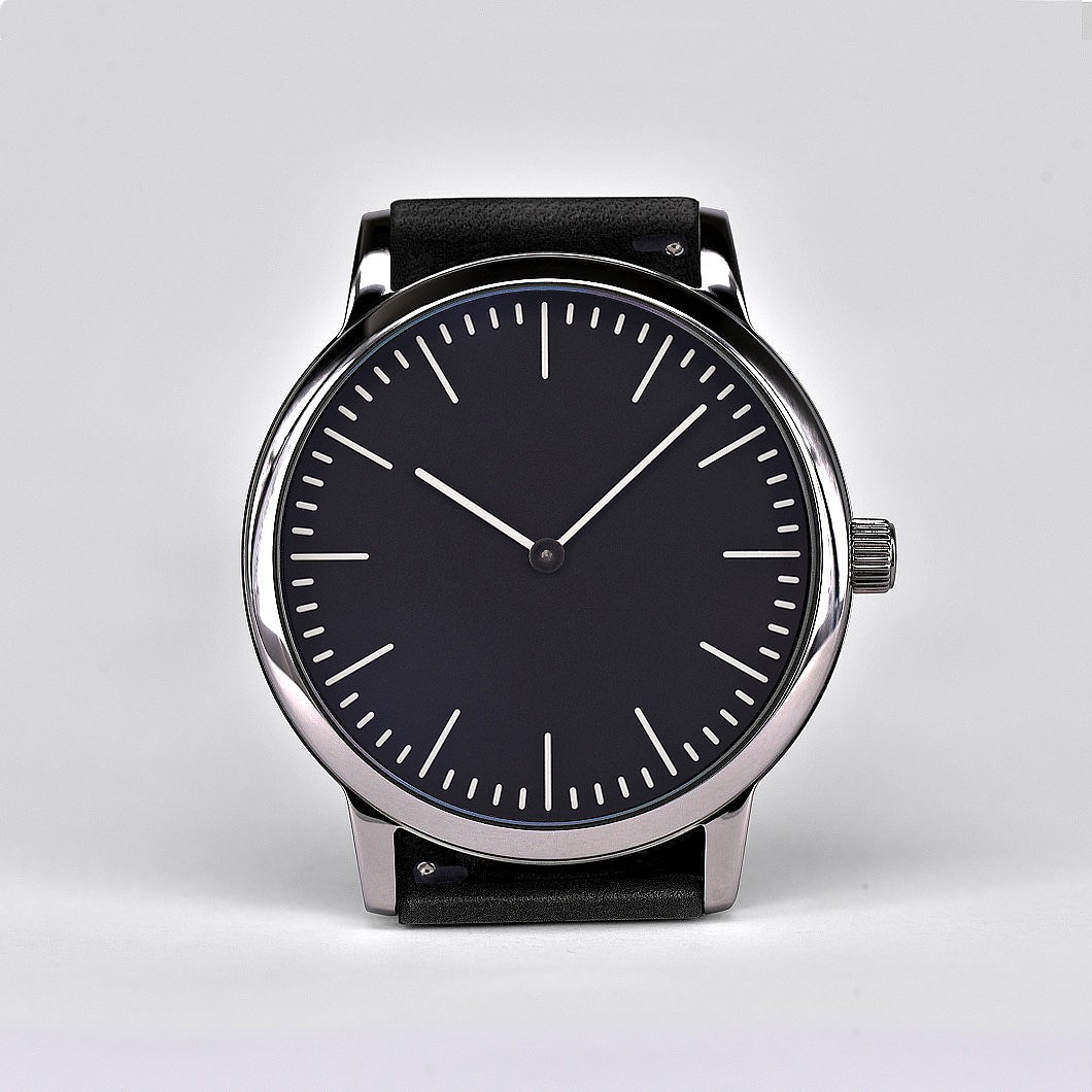Das 42mm Edelstahlgehäuse mit kratzfestem Saphirglas fasst das matt schwarze Zifferblatt und fluoreszierenden Indexen und Zeiger (Superluminova BGW9 und C1). Die Einzeigeruhr (wasserdicht 10 ATM) sticht durch ihren großen skelettierten Zeiger und ihre stark reduzierte 15 Minuten Zeitskalierung ins Auge. Das Design der automatischen Einzeigeruhr ist die Folge des Wunsches eine Uhr zu schaffen, welche die Zeitwahrnehmung entschleunigt und so zu einer entspannteren Wahrnehmung des Alltags führt.