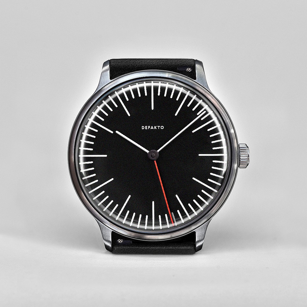 Die Defakto Eins Inkognito (42mm x 51mm x 9,8mm, 67g) ist ganz dem Purismus verschrieben. Neben ästhetischen Vorzügen bietet die logo-lose Einzeigeruhr eine weitere Besonderheit: Die Eignung sowohl für Links- als auch Rechtshänder ohne Umbau. Aufgrund der Gestaltung kann die Uhr um 180 Grad gedreht werden und am anderen Arm getragen werden.