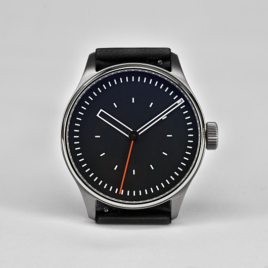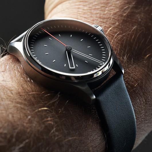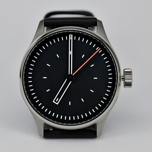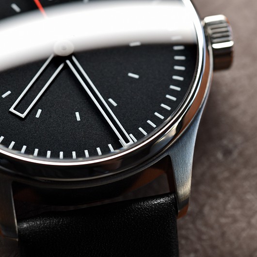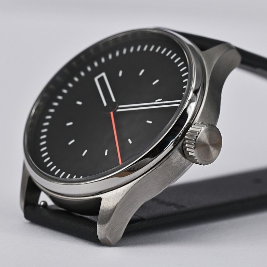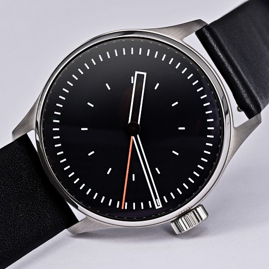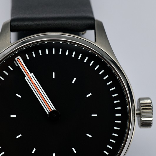 Die skelettierten Zeiger sind zu den getrennt dargestellten, durchscheinenden Minuten- und Stundenindexen des Zifferblattes in identischer Strichstärke angelegt und ermöglichen eine sehr gute, geführte Lesbarkeit. Das fein gebürstete dreiteilige 39 mm Uhrgehäuse aus gehärtetem Edelstahl kommt mit gewölbtem Saphirglas gibt der Uhr ihre elegant zurückhaltende Kompaktheit. Das verbaute Schweizer Automatik-Uhrwerk Sellita SW 200 zeigt verlässlich die Zeit an und bietet eine sehr gute Wartbarkeit. Optional kann die Uhr auch mit dem Handaufzugswerk Sellita SW 215 ausgestattet werden. Die fließende Sekunde bringt dabei kontinuierliche Bewegung ins kinetische Spiel und generiert ständig neue geometrische Konstellationen und symmetrische Überlagerungen direkt am Handgelenk des Trägers.