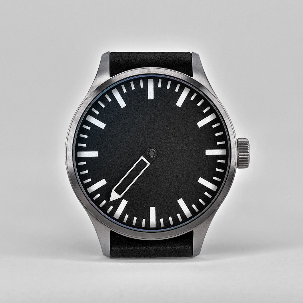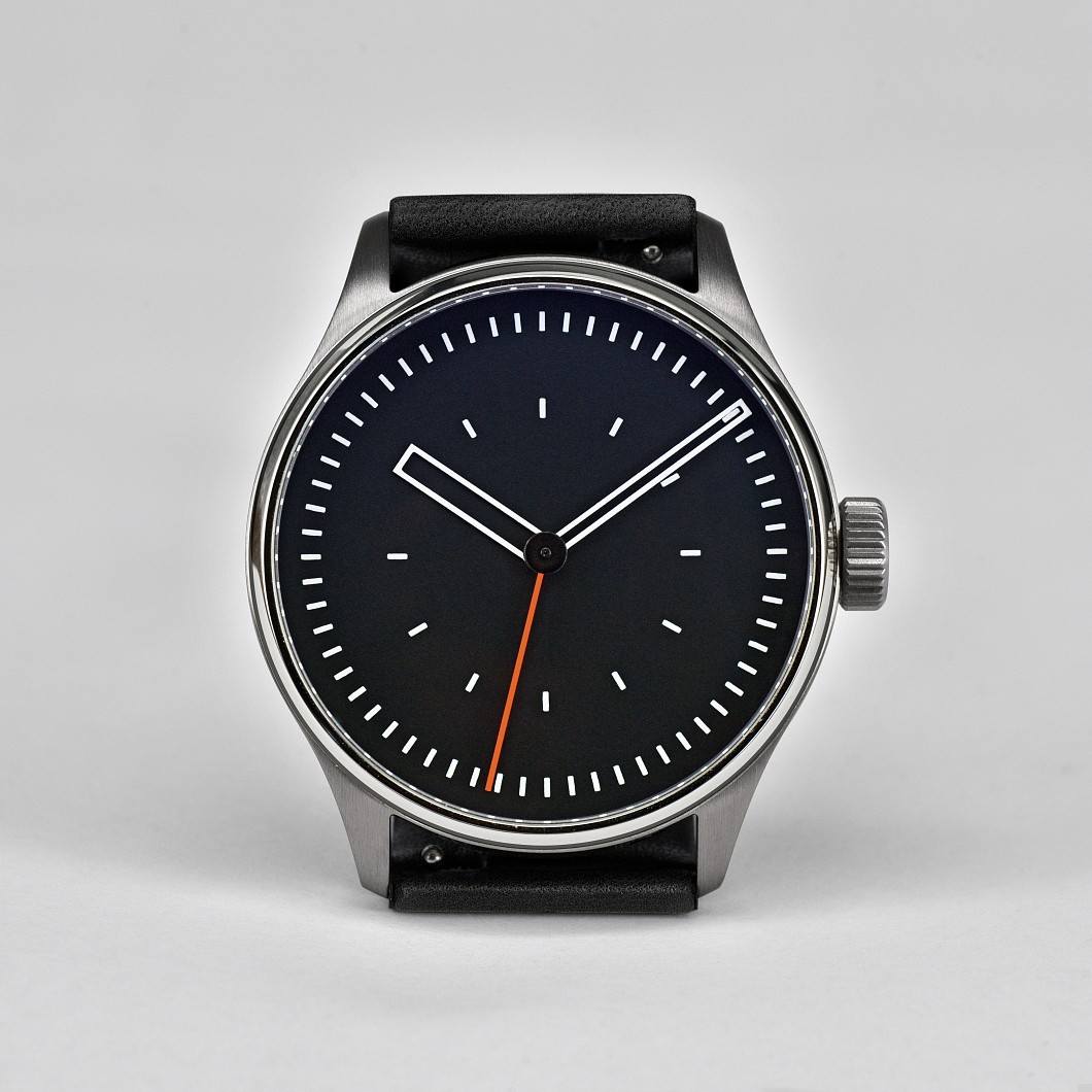 Der dem gewölbten Zifferblatt folgende gebogene Ein-Zeiger, ebenso wie alle großzügig angelegten Indexe des schwarz matten Zifferblatts sind mit stark nachtleuchtendem Superluminova BGW9 belegt. Das neu entwickelte, drei-teilige 40mm Edelstahlgehäuse (316L) hat eine Höhe von nur 9,8mm inklusive gewölbtem, innen entspiegeltem Saphirglas (Wasserdicht 5 ATM).