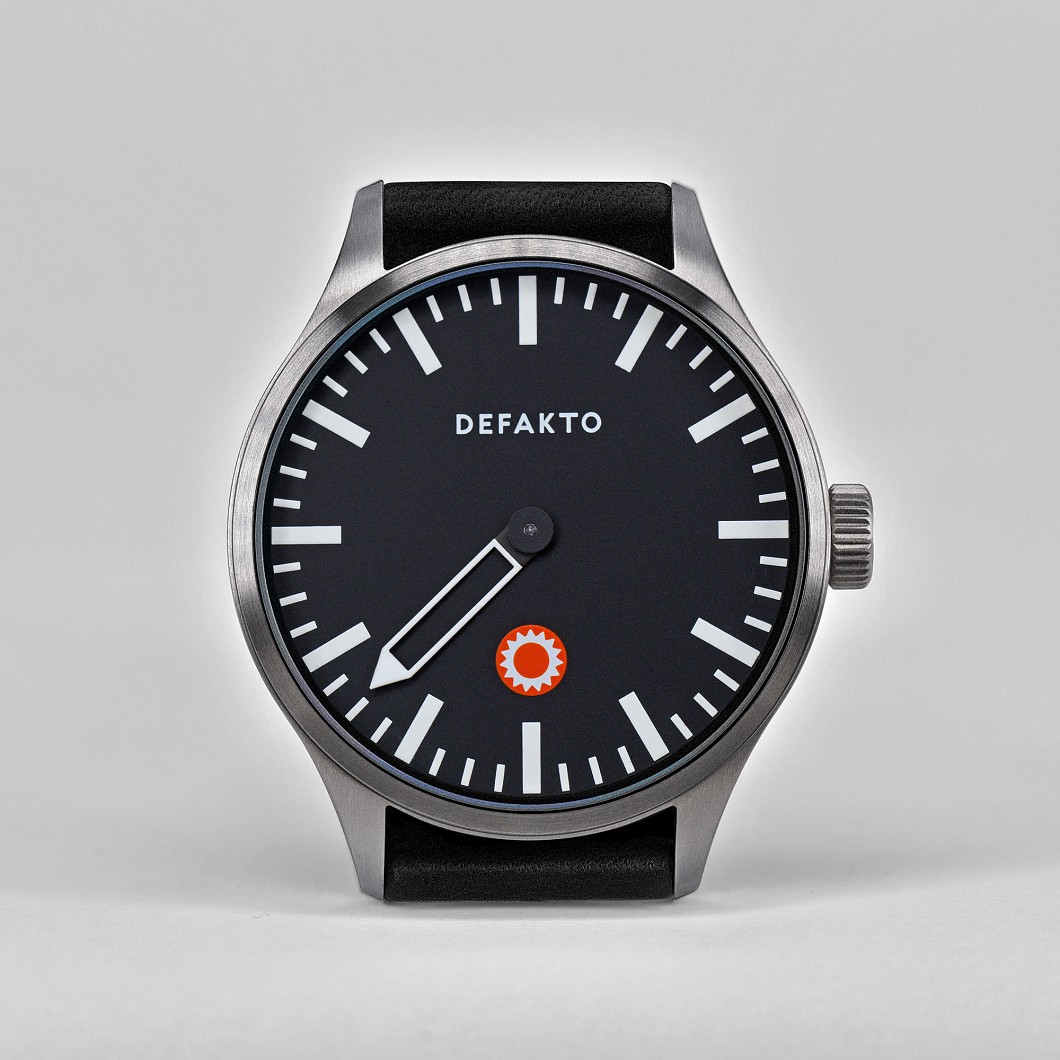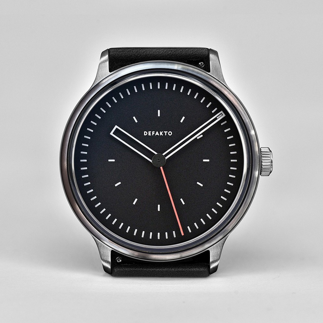 Die minimalistische, nachts stark leuchtende Einzeigeruhr Defakto Meta Inkognito (40mm x 44mm x 9,8mm, Gewicht 58g) basiert auf der Kernidee die intuitive Zeitwahrnehmung Ihres Trägers zufördern und so entschleunigend zu wirken. Da die Indizes nur die Stunden- und Viertelstundenperioden darstellen, wird auf der Defakto Meta die Zeit in ungefähren Intervallen und nicht in genauen Minuten oder Sekunden gelesen. Mit dem großen Einzelzeiger werden sowohl die Stunde als auch die ungefähre Minute gleichzeitig abgelesen.
